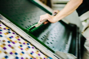 プリントが紙のようにスムーズに行かない場合も多く、状況に合わせて生地や機械のセッティングを調整していきます。